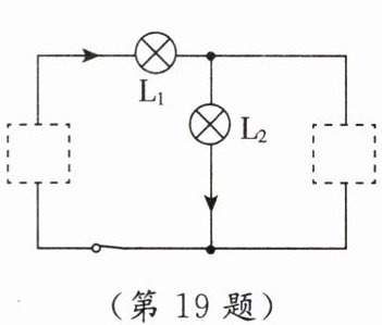 19. 如图所示,开关闭合后,电路中的电流方向为箭头所指方向,请将电池、电压表两个元件符号分别填入虚线框内,使开关闭合后灯泡$ L_1 $和$ L_2 $串联且都能够正常发光。