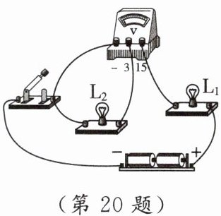 20. 如图所示的电路,在错误的导线上画“×”,并用笔画线代替导线完成电路的连接,要求:$L_1 $与$ L_2 $串联,电压表测量$ L_2 $两端电压,电压表用 0~3 V 量程,导线不能交叉。
