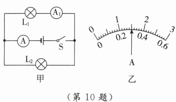 10. [2024·苏州期末]如图甲所示电路中,开关$S$闭合后,两个电流表指针位置均如图乙所示,经过$L_{2}$的电流为