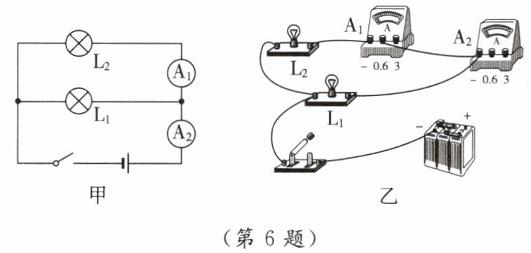 6. [2024·南通校级月考]图甲电路中,干路电流表示数为1A,支路电流表示数为0.4A。请用笔画线代替导线将图乙实物电路补充完整。