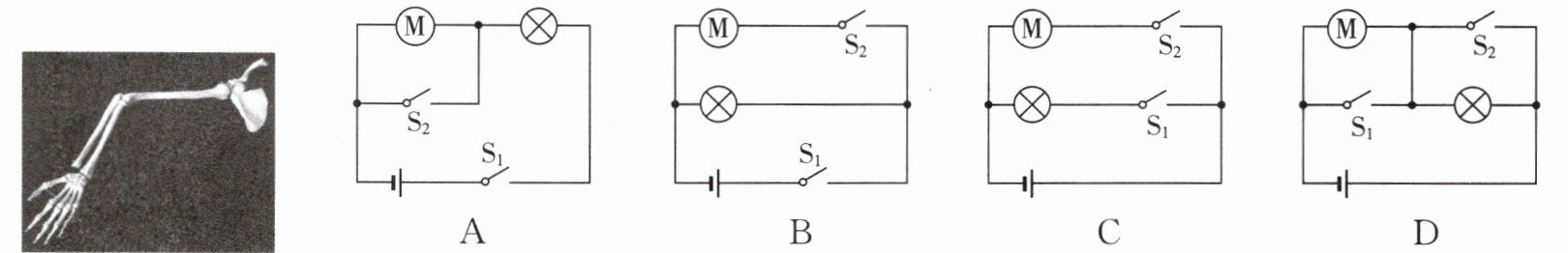 5. [2024·泸州]如图所示,为第38届泸州市青少年科技创新大赛上展示的一件手臂骨骼模型,小明打算对该作品进行改进,加装电动机带动轮子转动,使骨骼模型动起来,并加装指示灯。电路设计要求为:只闭合开关$S_{1}$,仅指示灯亮;再闭合开关$S_{2}$,指示灯亮,电动机M转动;断开开关$S_{1}$,指示灯熄灭,电动机M停止转动。满足该设计要求的电路是(