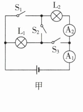 9.$S_{1}$、$S_{3}$;$1$;$L_{2}$;$S_{1}$、$S_{2}$、$S_{3}$[点拨]当开关$S_{1}$、$S_{3}$闭合,$S_{2}$断开时,两灯并联,电流表$A_{1}$测干路电流,电流表$A_{2}$测通过$L_{2}$的电流。由图乙和图丙可知,电流表$A_{1}$的指针偏转角度小于电流表$A_{2}$的指针偏转角度,由于并联电路干路中的电流等于各支路中的电流之和,则电流表$A_{1}$的示数大于电流表$A_{2}$的示数,所以电流表$A_{1}$选择的是大量程,分度值为0.1A,示数为1.5A,即干路中的电流$I = 1.5\ \text{A}$,电流表$A_{2}$选择的是小量程,分度值为0.02A,示数为0.5A,即通过$L_{2}$的电流$I_{2} = 0.5\ \text{A}$,所以通过$L_{1}$的电流$I_{1} = I - I_{2} = 1.5\ \text{A} - 0.5\ \text{A} = 1\ \text{A}$。只闭合开关$S_{1}$、$S_{2}$时,灯$L_{1}$被短路,电路为灯$L_{2}$的简单电路,所以灯$L_{1}$不能发光,$L_{2}$发光;当$S_{1}$、$S_{2}$、$S_{3}$同时闭合时,会造成电源短路,易损坏电源,应坚决避免。