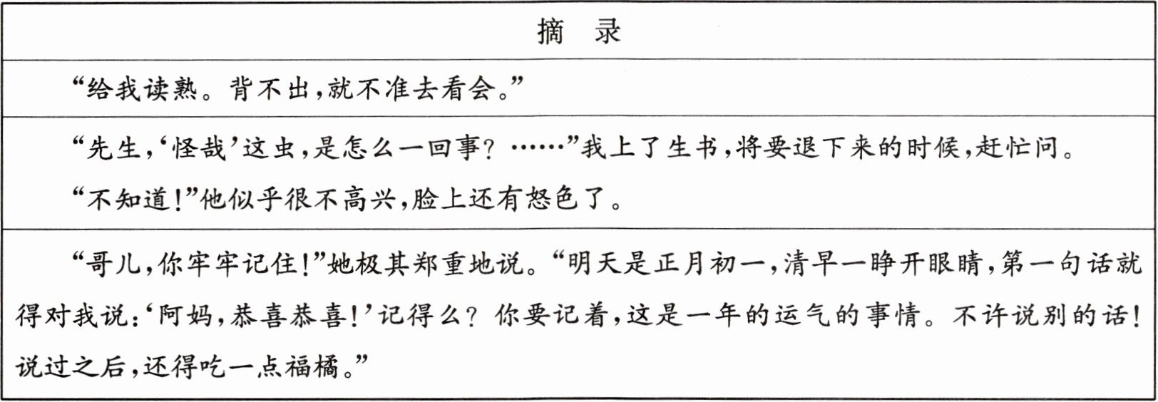 <table><tbody><tr><td>摘 录</td></tr><tr><td>“给我读熟。背不出,就不准去看会。”</td></tr><tr><td>“先生,‘怪哉’这虫,是怎么一回事?……”我上了生书,将要退下来的时候,赶忙问。“不知道!”他似乎很不高兴,脸上还有怒色了。</td></tr><tr><td>“哥儿,你牢牢记住!”她极其郑重地说。“明天是正月初一,清早一睁开眼睛,第一句话就得对我说:‘阿妈,恭喜恭喜!’记得么?你要记着,这是一年的运气的事情。不许说别的话!说过之后,还得吃一点福橘。”</td></tr></tbody></table>