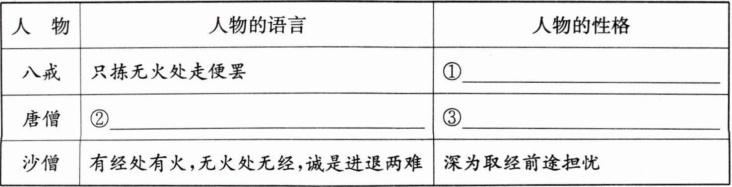 <table><tbody><tr><td>人 物</td><td>人物的语言</td><td>人物的性格</td></tr><tr><td>八戒</td><td>只拣无火处走便罢</td><td>①______</td></tr><tr><td>唐僧</td><td>②______</td><td>③______</td></tr><tr><td>沙僧</td><td>有经处有火,无火处无经,诚是进退两难</td><td>深为取经前途担忧</td></tr></tbody></table>