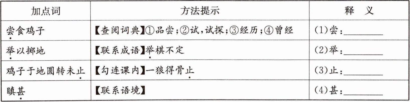 |尝食鸡子|【查阅词典】①品尝;②试,试探;③经历;④曾经|(1)尝:______|