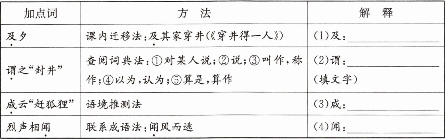 |及夕|课内迁移法:及其家穿井(《穿井得一人》)|(1)及:______|
