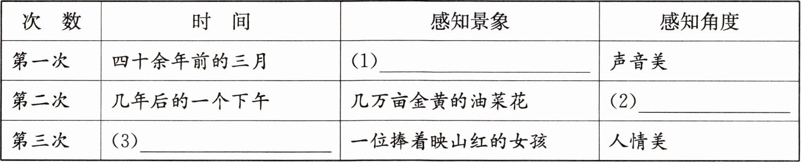 2.文章叙写了“我”三次感知春天的经历,请结合文章内容,根据示例填写表格。(3 分)