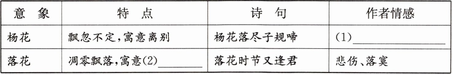 |杨花|飘忽不定,寓意离别|杨花落尽子规啼|(1)____|