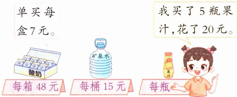 【点拨】先算出整箱购买的酸奶平均每盒的价钱,列除法算式为 48÷8=6(元),再用单买每盒的价钱减去整箱购买平均每盒的价钱,列减法算式为 7-6=1(元),合成综合算式为 7-48÷8=1(元)。