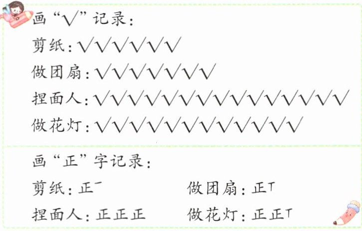 画“正”字记录中,一个“正”字代表5人,“正一”表示5 + 1 = 6人,即剪纸6人;“正T”表示5 + 2 = 7人,即做团扇7人;“正正正”表示3×5 = 15人,即捏面人15人;“正正T”表示2×5 + 2 = 12人,即做花灯12人。