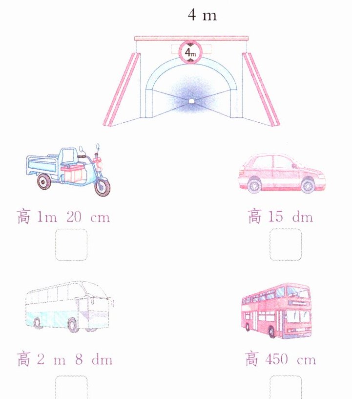 【点拨】这里可以都转化成cm作比较。隧道高4m,即400cm。三轮车高度是1m20cm,即120cm;小轿车高度是15dm,即150cm;中巴车高度是2m8dm,即280cm;双层大巴车高度是450cm。因为120<150<280<400<450,所以能安全通过隧道的有三轮车、小轿车、中巴车。