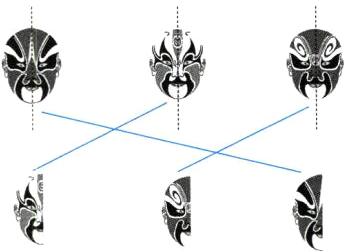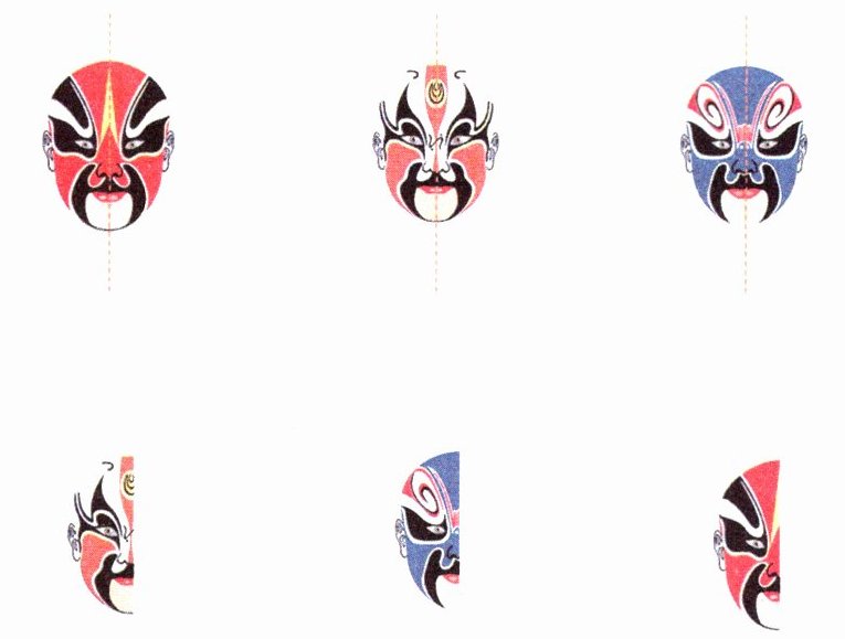 1. 下面第一行的三个脸谱顺着虚线对折后,会分别变成第二行中的哪一个?画线连一连。(12分)