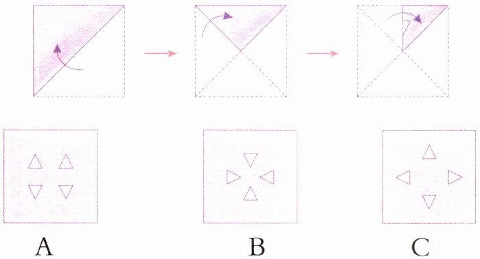 5. 像下面这样把一张正方形纸连续对折三次,剪下一个小三角形后剩下的图案是( )。