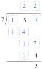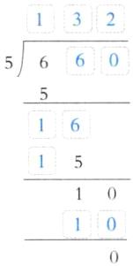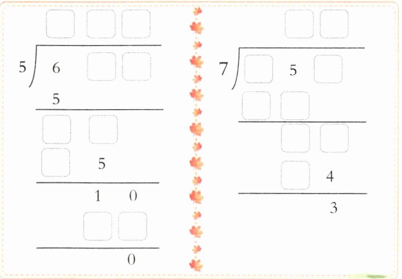 [点拨]第1个竖式,根据商的百位与除数的积是5,得商的百位上是1,并且6 - 5=1。商的十位与除数相乘应该得15,因此商的十位上是3,根据15 + 1=16,可得被除数的十位数字是6。商的个位与除数的积一定是10,因此商的个位上是2,被除数的个位上是0。第2个竖式,从已知部分入手,由商个位上的数和除数7相乘的积是□4,可以判断出商的个位上是2,这是因为在0 - 9这些数字中,只有2×7=14满足积的个位数字是4,所以能判断出商的个位数字是2。又因为一个数减去14等于3,通过14 + 3=17,可知这个数是17,其中“7”是从被除数个位上移下来的,进而得出被除数的个位上的是7,随后依照此方法依次推出其他数位上的数。
