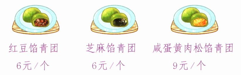 (3)红豆馅:378÷6÷3=21(个) 芝麻馅:672÷6÷4=28(个) 咸蛋黄肉松馅:630÷9÷2=35(个) 21<28<35 答:红豆馅青团平均每天卖的个数最少,咸蛋黄肉松馅青团平均每天卖的个数最多。 [点拨]用总钱数÷单价÷天数求出各种青团平均每天卖出的个数,再比较得出结论。