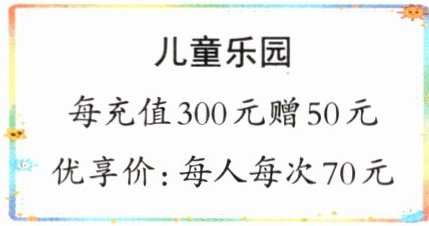(1)40+300+50=390(元)390÷70=5(次)……40(元)答:现在会员卡里的钱够天天玩5次。【点拨】先根据“原来的钱数+充值的钱数+赠送的钱数”求出现会员卡里的钱数,再除以70元得到的商就是现在会员卡里的钱够天天玩的次数,剩余的40元不够天天玩一次,所以最后用“去尾法”取值。