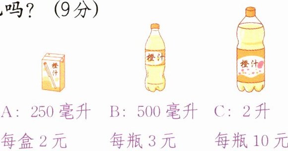 (2)星期天,典典和妈妈去超市买东西,妈妈指着货架上同款不同大小包装的三种橙汁问典典:“典典,这三种橙汁买哪种最合算啊?”典典算了好久,也没算出来,聪明的小朋友,你能帮帮他吗? (9分)