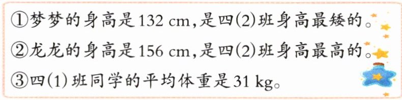 @@(2)B 【点拨】平均体重反映的是全班同学体重的平均水平,有的同学的体重可能比平均体重大一些,有的同学的体重可能比平均体重轻一些,有的同学的体重可能和平均体重相同。因为四(1)班同学的平均体重是31 kg,所以蓝蓝的体重可能是35 kg。