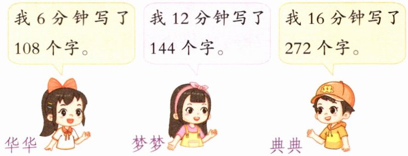 (1) (华华) (6)分钟 (108)个 (梦梦) (12)分钟 (144)个 108÷6=18(个)144÷12=12(个)18>12 18-12=6(个)答:华华平均每分钟写的字多,多6个。