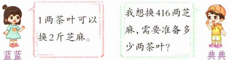 【点拨】先求出1两茶叶可以换多少两芝麻,即16×2=32(两);再求416两里有多少个32两,就是需要准备多少两茶叶。