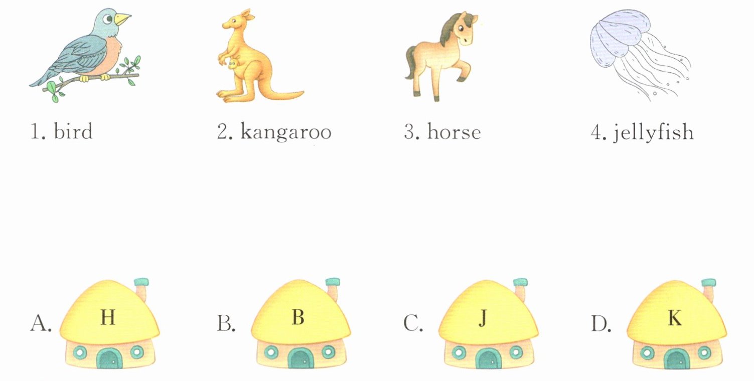 一 新情境 给动物指路 小动物们找不到回家的路了,请你帮它们回到自己的家吧!将单词首字母与对应大写字母匹配。