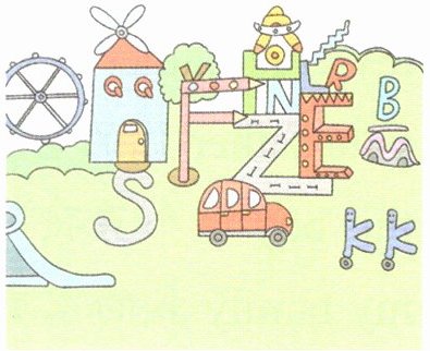 一 字母辨析 Mike 的班级举行了派对,他和同学们在黑板上贴了许多手绘作品。请你找出至少 5 个学过的字母,在四线三格内写出对应的大小写。