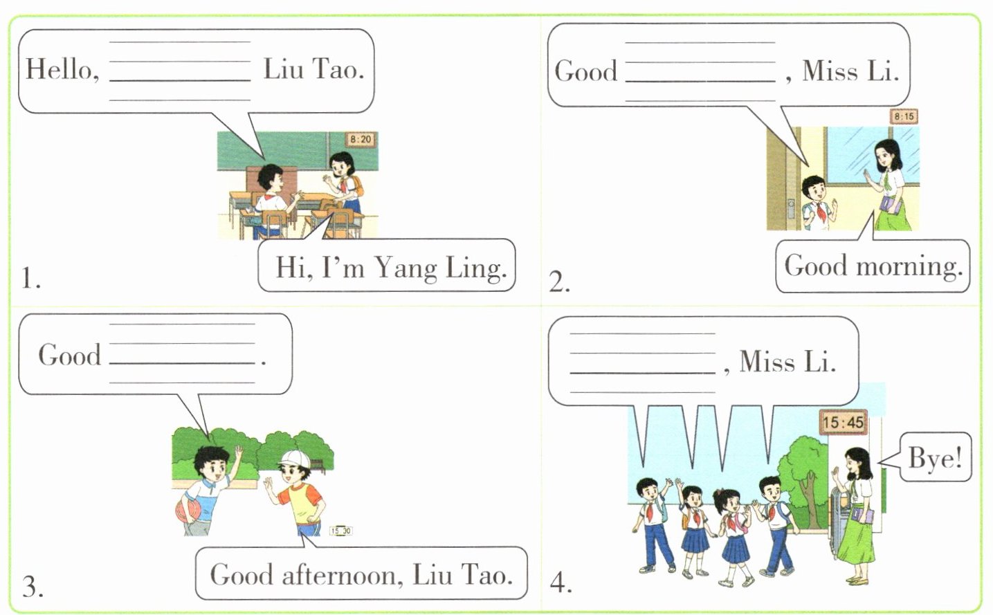 1. I'm 2. morning 3. afternoon 4. Goodbye