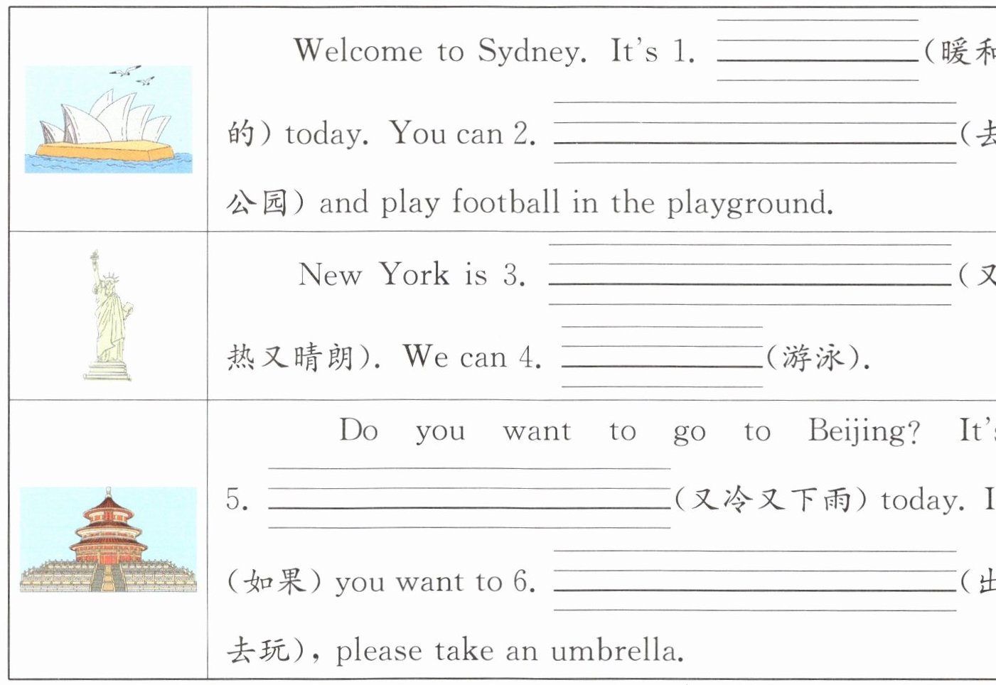 1. warm 2. go to the park 3. hot and sunny 4. swim 5. cold and rainy 6. play outside