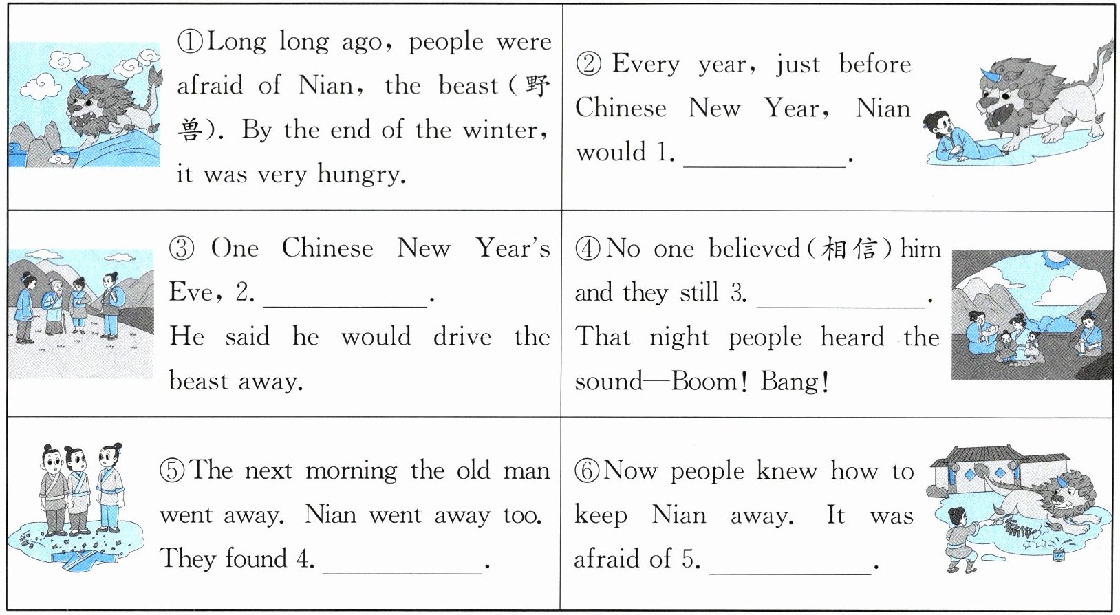 五 新语境 传统文化 关于年的传说你知道多少呢?根据上下文及图片,为故事插图配上文字将故事补充完整,并将短语抄写在横线上。