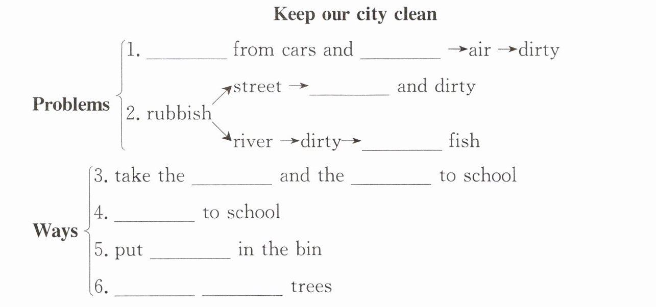 1. smoke, factories 2. messy, dead 3. bus, metro 4. walk 5. rubbish 6. plant more