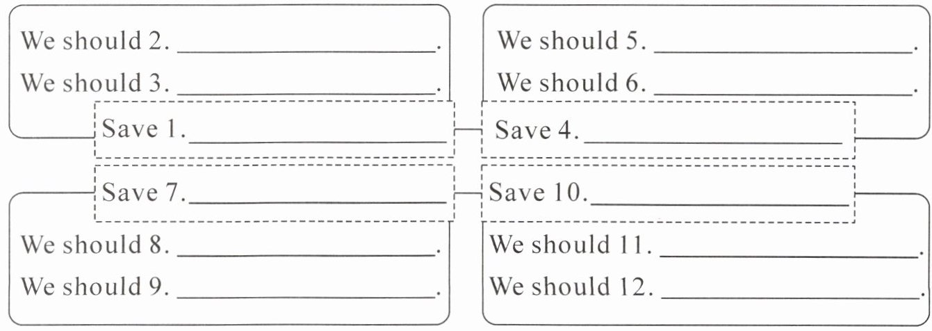 1. water 2. not waste water 3. reuse and save it 4. energy 5. save energy 6. not drive so much 7. trees 8. not cut down too many trees 9. plant more trees 10. plastic 11. not use too many plastic bags or bottles 12. use paper bags and glass bottles