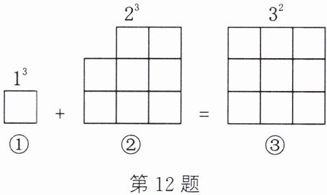 12. (教材 P148“探究”变式)如图,由图①、图②和图③中小正方形个数的关系,得到 $ 1^3 + 2^3 = (1 + 2)^2 = 3^2 $. 类似地,继续结合图形验证你的猜想,并应用其蕴含的规律求 $ 1^3 + 2^3 + 3^3 + … + 100^3 $ 的值(结果保留幂的形式).