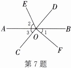7. (教材P172例1变式)如图,直线$AB$,$CD相交于点O$,$OE是∠AOD$的平分线,$∠FOC= 90^{\circ}$,$∠1= 40^{\circ}$,求$∠2与∠3$的度数.