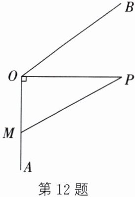 12. (新考法·综合与实践)如图,$AO-OB$为一条在点O处拐弯的河,要修建一条从村庄P通向这条河的道路.现在有以下两种方案:一是沿PM修路;二是沿PO修路(这里满足$PO\bot AO$).如果不考虑其他因素,那么上述两种方案哪种更经济些?它是否是最佳方案?如果不是,请你帮助设计出最佳方案.