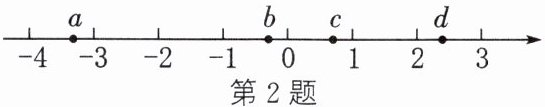 2. (2023·长春)数a,b,c,d在数轴上对应点的位置如图所示,这四个数中绝对值最小的是 (