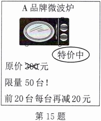 15. (新情境·现实生活)如图所示为某电器行的促销活动传单.已知促销第一天 A 品牌微波炉卖出 10 台,且其销售额为 2300 元.若活动期间此款微波炉总共卖出 50 台,则这些微波炉的总销售额为多少元?