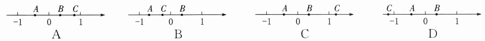13. (2023·杭州)已知数轴上的点A,B分别表示数a,b,其中$-1\lt a<0,0\lt b<1$.若$a×b= c$,数c在数轴上用点C表示,则点A,B,C在数轴上的位置可能是(
