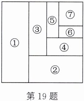 19. (数形结合思想)如图,将一张边长为1的正方形纸片分割成7个图形,图形①的面积是正方形纸片面积的$\frac {1}{3}$,图形②的面积是图形①面积的2倍的$\frac {1}{3}$,图形③的面积是图形②面积的2倍的$\frac {1}{3}$……图形⑥的面积是图形⑤面积的2倍的$\frac {1}{3}$,图形⑦的面积是图形⑥面积的2倍.计算$\frac {1}{3}+\frac {2}{9}+\frac {4}{27}+... +\frac {2^{5}}{3^{6}}$的结果为