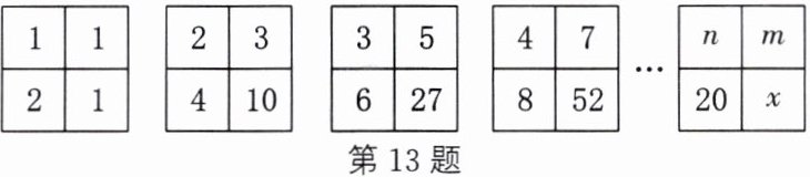 13. 如图,每个图形中的四个数都是按相同的规律填写的,根据此规律可以确定代数式$mn-x$的值为