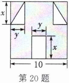 20. (2025·相城区期末)“囧”是网络流行语,像一个人脸郁闷的神情,如图所示.一张边长为10的正方形的纸片,剪去两个一样的小直角三角形和一个小长方形得到一个“囧”字图案(涂色部分).设剪去的小长方形的长和宽分别为$x,y$,剪去的两个小直角三角形的两直角边长也分别为$x,y$.