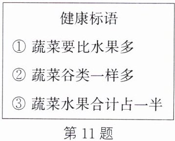 11. 某研究机构对于一般人如何搭配"谷类""蛋白质""蔬菜""水果"这四大类食物的摄取份量,用"健康标语"的形式说明了这四大类食物所应摄取份量的关系(如图),请你判断一个人每日所应摄取的"水果"和"蛋白质"份量之间的大小关系.