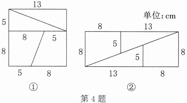 4. (新考法·探究题)小明有一张边长为13cm的正方形纸片(如图①),他想将其剪拼成一张一边长为8cm的长方形纸片.他想了一下,不一会儿就把原来的正方形纸片剪拼成了一张长21cm、宽8cm的长方形纸片(如图②),你认为小明剪拼得对吗? 请说明理由.