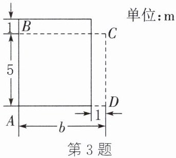 3. (2023·金华)如图所示为一块长方形菜地ABCD,$AB= 5m,AD= bm$,面积为$s{m}^{2}$.现将边AB增加1m,边AD减少1m,得到的长方形菜地的面积不变,则b的值是______.