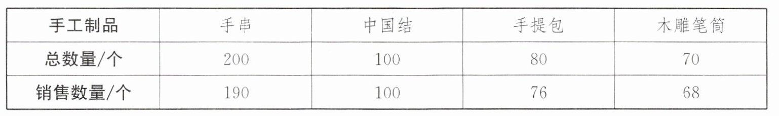 3. 某地开展以“心手相连,共浴阳光”为主题的手工制品义卖销售活动。某校将同学们手工制作的手串、中国结、手提包、木雕笔筒的相关销售信息汇总如下表: