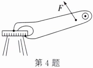 4. 如图所示,用开启啤酒瓶盖的工具开启瓶盖。请在图中标出支点$O$的位置,画出力$F$的力臂。