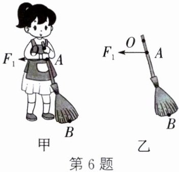 6. 如图甲所示,小华在水平地面上用笤帚扫地。$O$为支点,作用在$A点的动力为F_{1}$。在图乙中画出作用在$B点的阻力F_{2}的示意图及其力臂l_{2}$。
