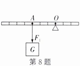 8. 如图所示,一根质量忽略不计的杠杆,支点为$O$,在$A点悬挂一重为20N$的物体,物体对杠杆的拉力为$F_{1}$。现在杠杆上施加一个大小为$10N$、方向竖直向上的力$F_{2}$,杠杆在水平位置保持平衡,请在图中画出拉力$F_{1}的力臂l_{1}以及拉力F_{2}$的示意图。
