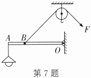 7. 某剧组为拍摄节目需要,设计了如图所示的拉力装置来改变照明灯的高度,轻质杠杆$ABO可绕O$点转动,请在图中画出杠杆所受拉力的力臂$l_{1}和杠杆所受阻力F_{2}$的示意图。