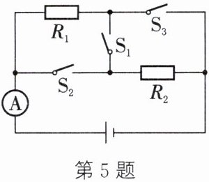 5. (2024·苏州工业园区校级二模)如图所示的电路中,电阻$R_{1}$的阻值为20Ω,电源电压不变,$S_{1}$、$S_{2}$断开,$S_{3}$闭合时,电流表的示数为0.6A;$S_{1}$断开,$S_{2}$、$S_{3}$闭合时,电流表的示数为0.9A。求: