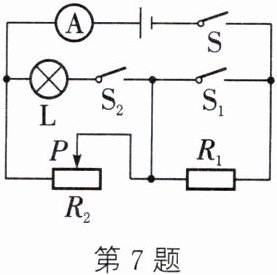 7. (2024·苏州校级段考)如图所示,电源电压保持不变,电阻$R_{1}= 10Ω$,滑动变阻器$R_{2}$的最大阻值为20Ω,灯泡电阻不随温度变化。闭合开关S,当开关$S_{1}$、$S_{2}$都断开,滑动变阻器的滑片P滑动到中点时,电流表的示数为0.4A;当开关$S$、$S_{1}$、$S_{2}$都闭合,滑动变阻器的滑片P滑动到最右端时,电流表的示数为0.9A。